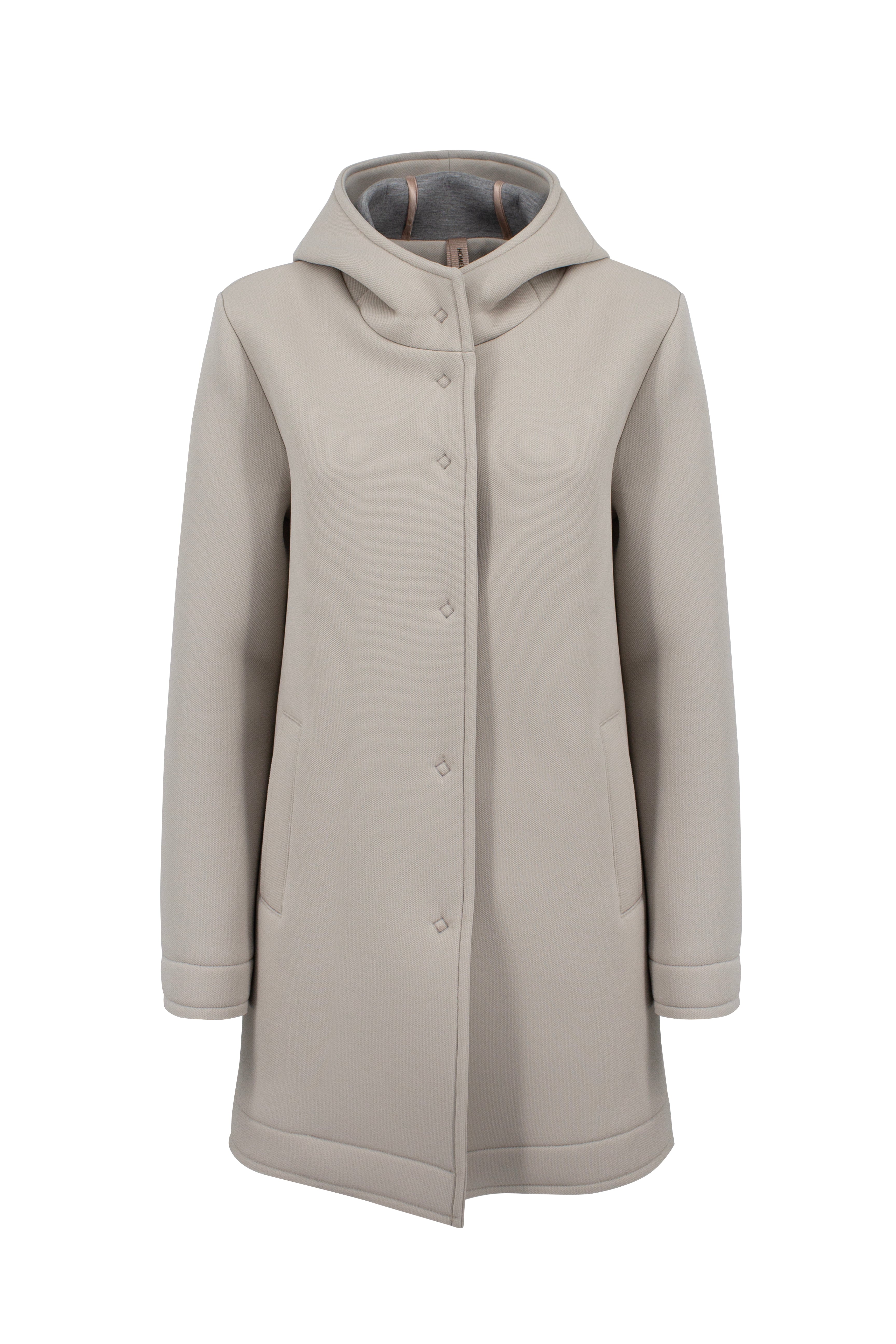 Giacca corta con cappuccio, realizzata in tessuto tecnico piquet accoppiato.