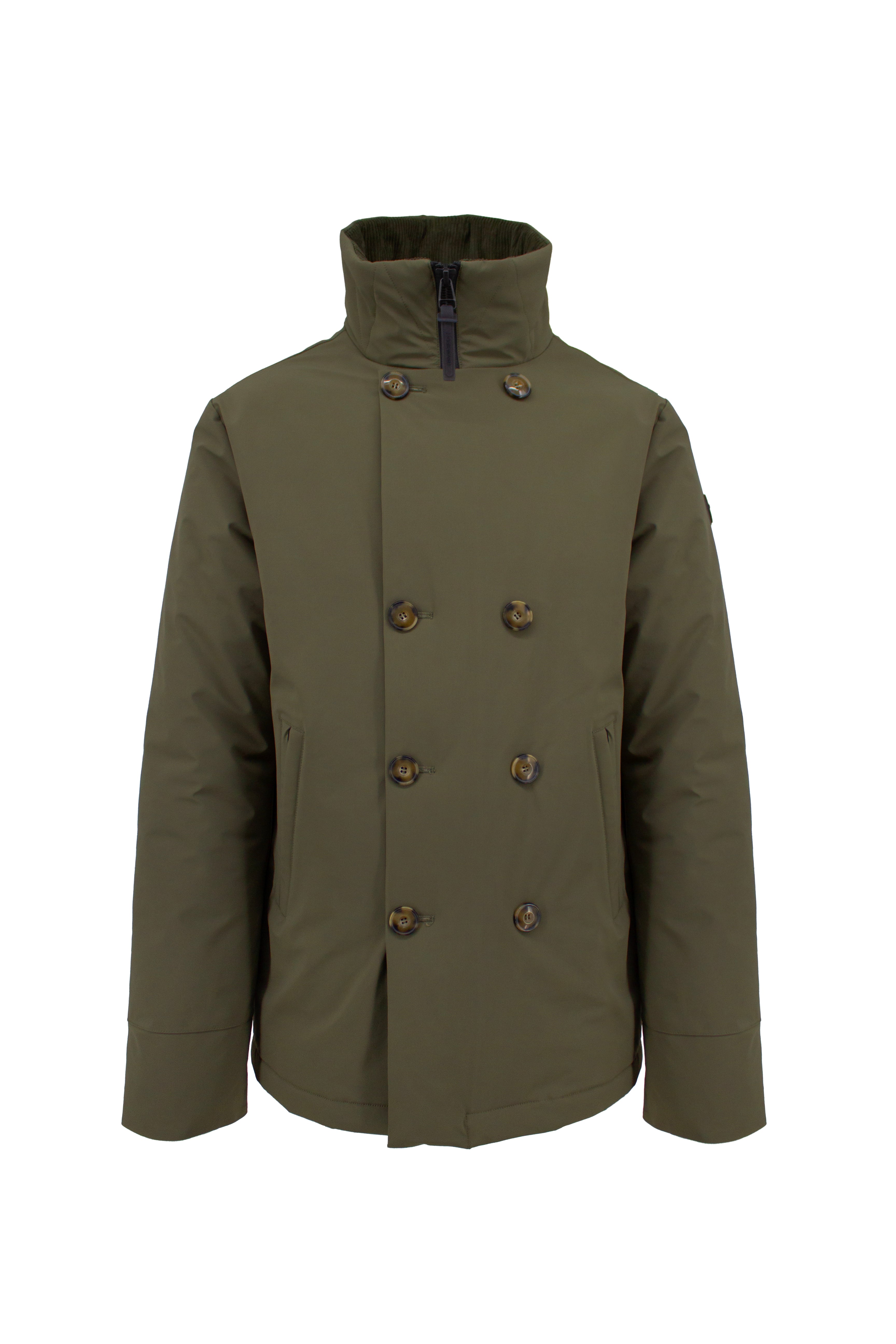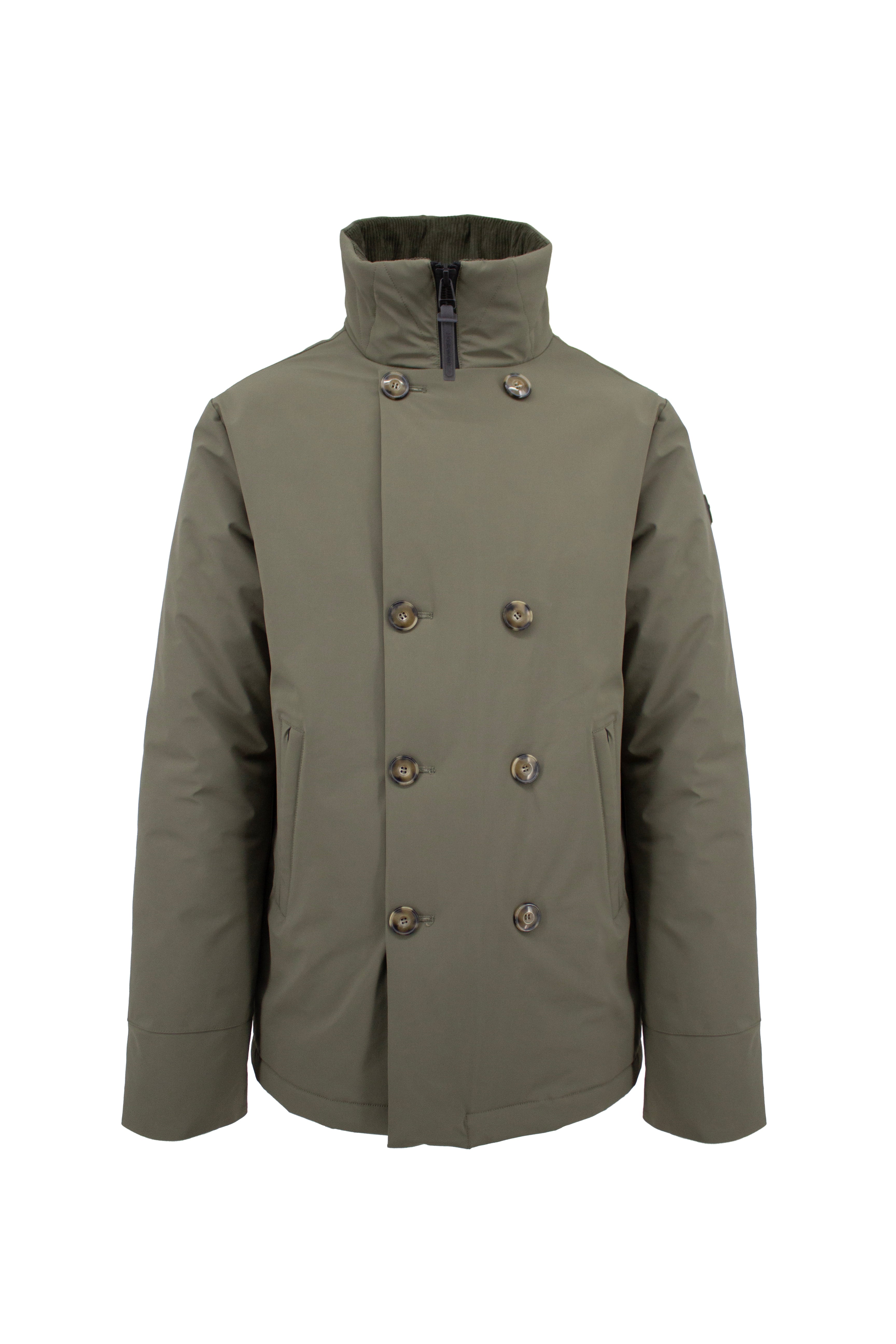 Cappottino doppiopetto tecnico. Tessuto esterno in nylon stretch giapponese, resistente all'acqua e al vento.