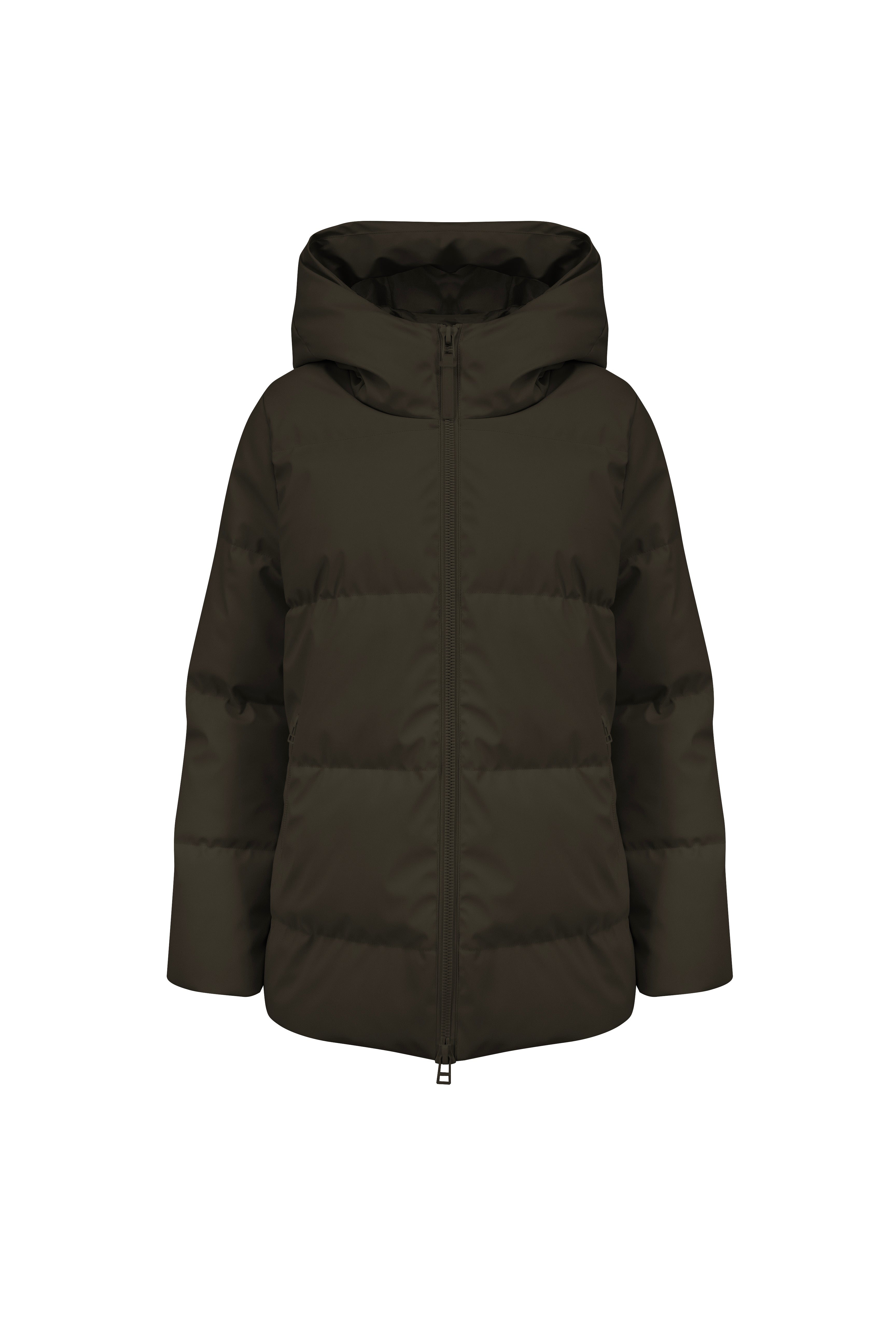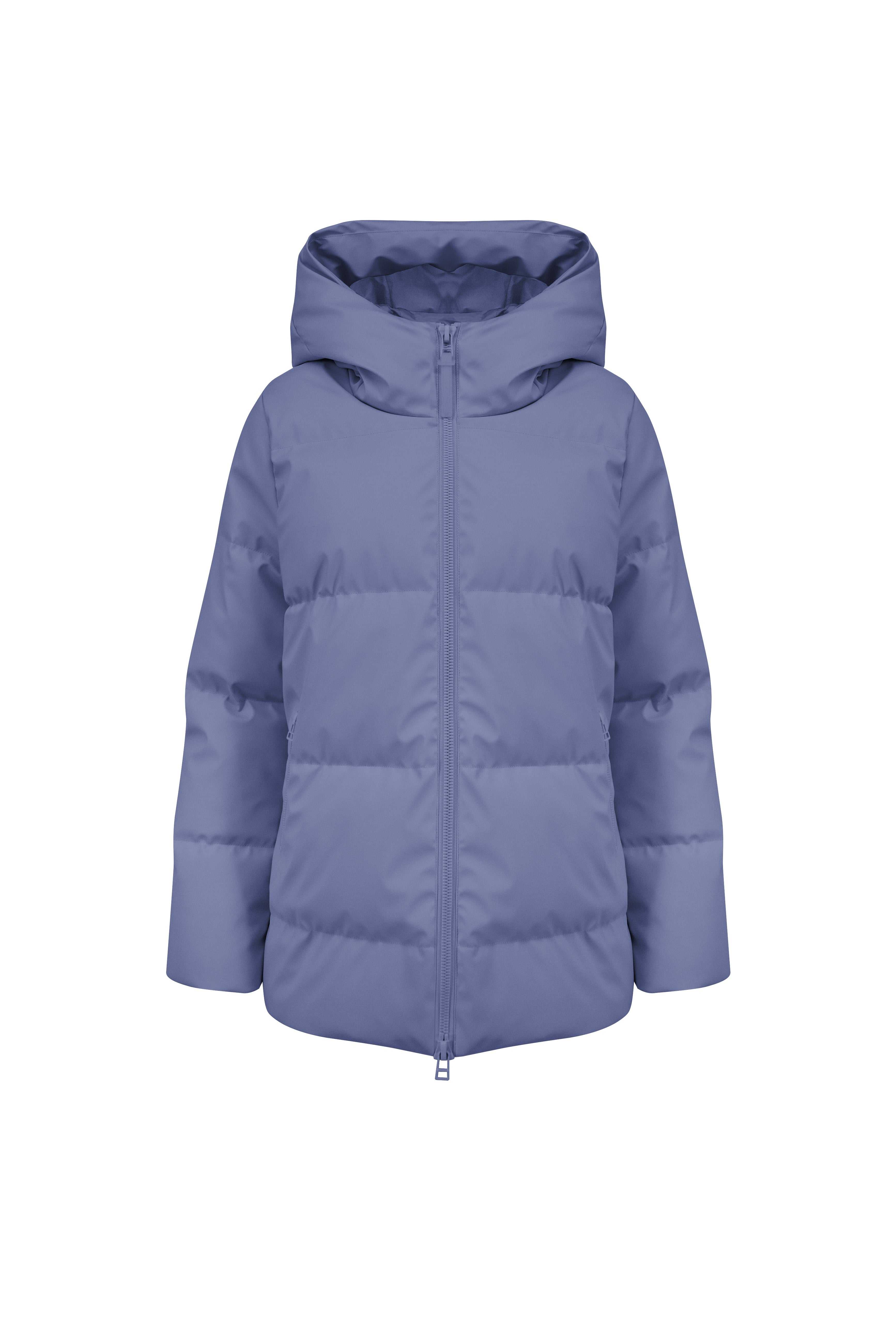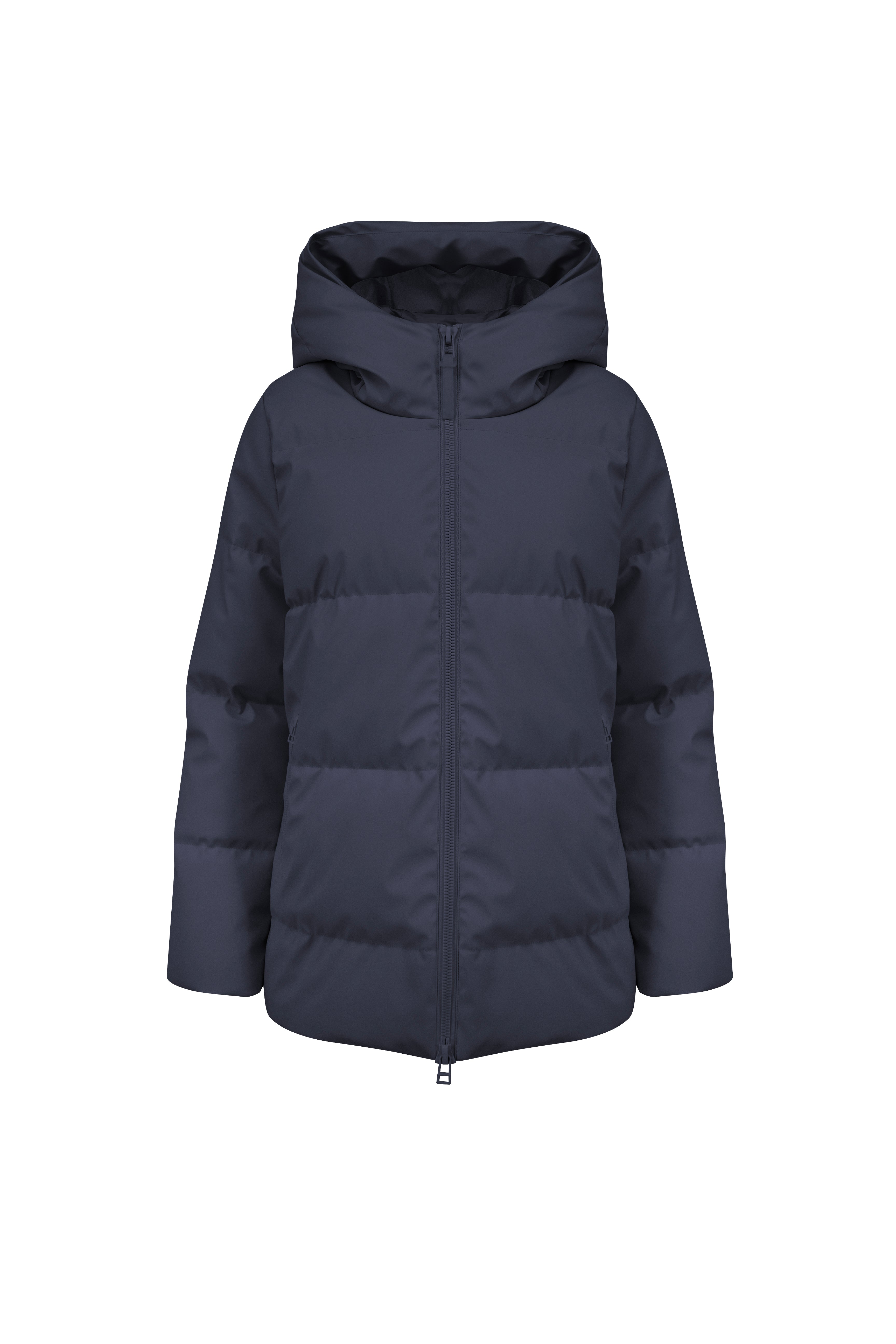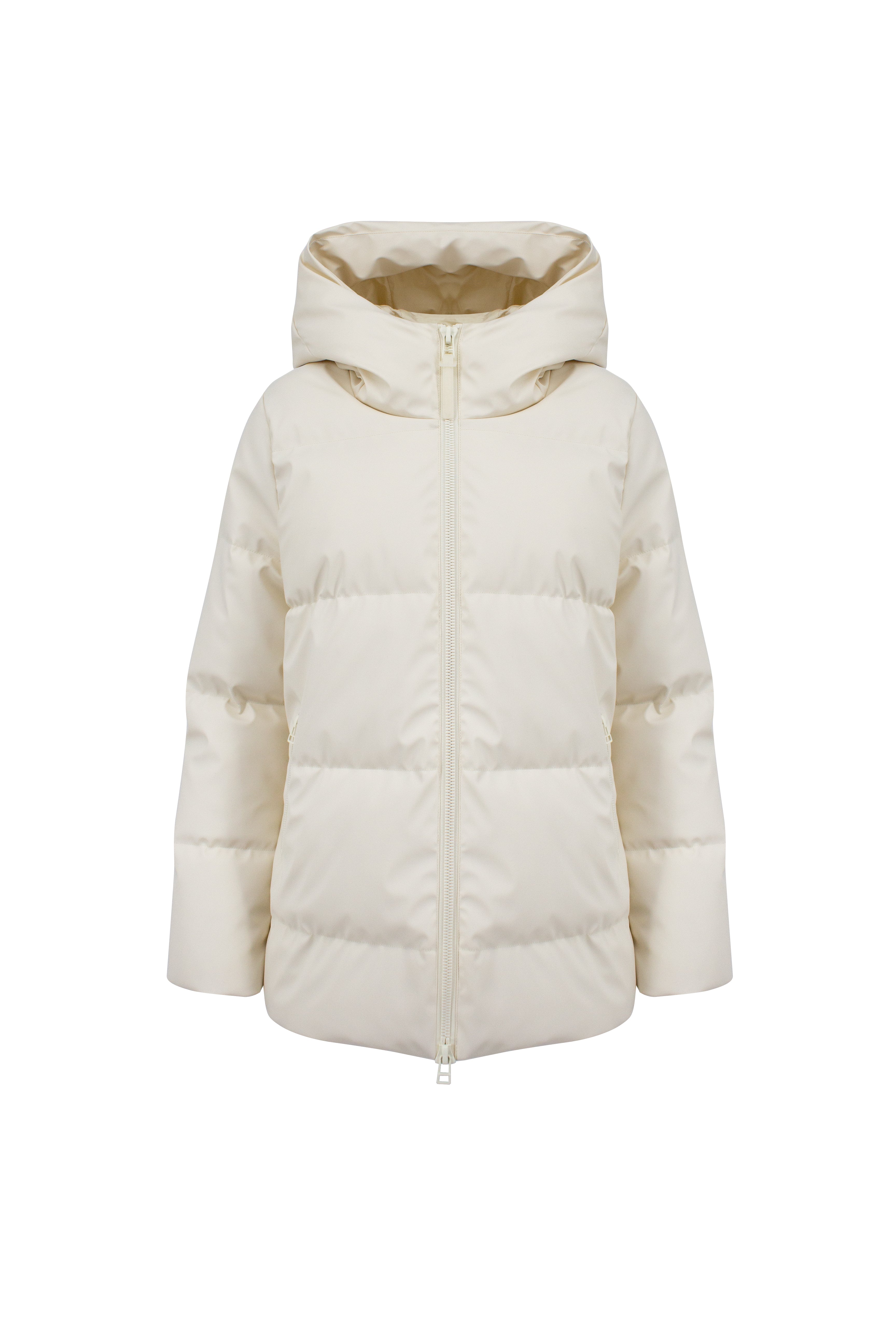 Giacca corta imbottita trapuntata con cappuccio. La spalmatura esterna in poliuretano rende il capo impermeabile e resistente al vento. Imbottita con soffice eco piuma